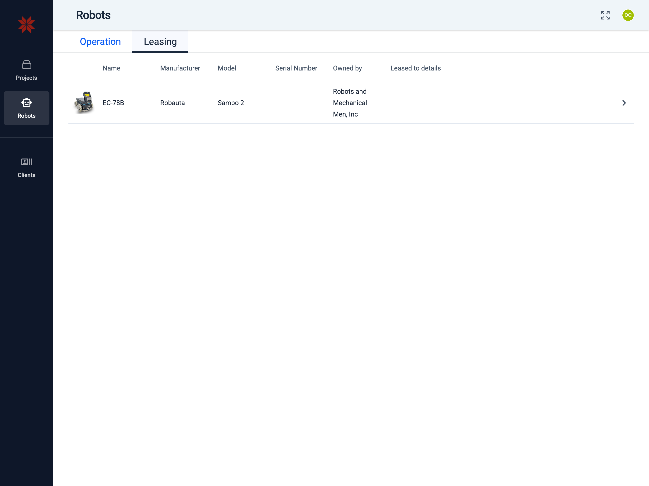 In this tab, you can view and manage all robots that are either owned by your organization or leased to you. You also have the ability to transfer robot ownership or lease your robots to other organizations.